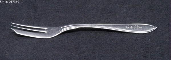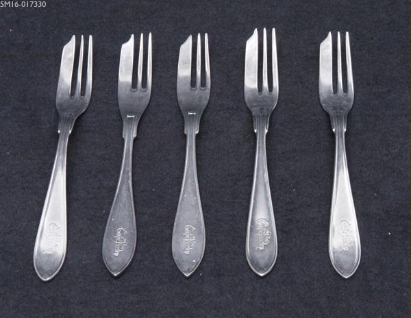 Tårtgafflar, 26 st, med tre klor varav den nedre mycket bredare. På skaftets ovansida står: Café Freden, med sirliga bokstäver. På skaftets undersida står: SV. ROSTFR STÅL. Har använts på Café Freden i Lidköping, på Stenportsgatan, kvarteret Giraffen. Byggnaden riven på 1980-talet. Här återfinns idag De La Gardie-gymnasiets yrkesprogram. Gåva av Monika Eklund, Lidköping, som fått dem av sin sambo Stig-Olof Spira vars föräldrar drev kafét.