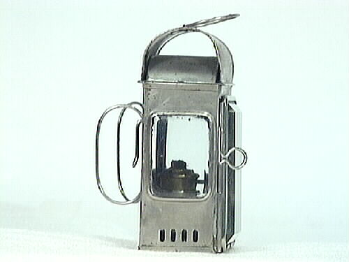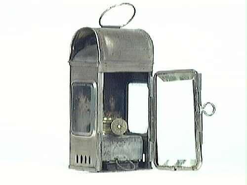 Lykta, liten oljelykta med runt tak.Liten brännare av mässing. Under den ett fyrkantigt oljehus, detta går att dra ut vid påfyllning. Tre sidor är glasade med tjockt slipat glas. Den glasade framsidan fungerar även som lucka med fungerade stängningssprint. På baksidan två öglor och en krok att fästa fast lyktan med, samt ett handtag överst. Brännaren är märkt: "OELBRENNER" samt oljehuset: "H o L "...Visa hela