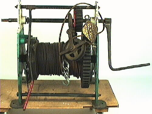 Däcksvinsch från pontonkran i Kungsviken på västkusten. Vajertrumman är uppfäst mellan två triangulära sidoväggar vilka är målade i grönt och vitt. Två plattjärnsfästen på varje gavel. Gavlarna stagas upp med två järnstänger nedtill och en upptill. Vajertrumman har 52 meter vajer. Trumman har i ena sidan ett kugghjul som drivs av det mindre kugghjulet vilket är fäst vid den järnaxel på vilken ett ...Visa hela