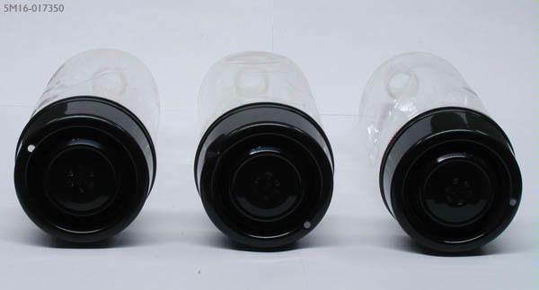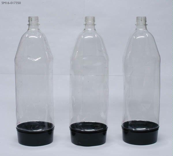 • Tre genomskinliga flaskor av PET-plast med svart botten, så kallad base-cup. Flaskorna är formblåsta, medan bottnarna är formpressade. Volym två liter. Modellen tillhörde de tidiga engångs-PET-flaskorna. I botten står PLM och SP i relief på samtliga tre, samt varje flaska har dessutom var sin siffra, 7, 10 eller 11. PLM är företaget som har tillverkat flaskan. Själva PET-flaskan har tillverkats i ... Visa hela