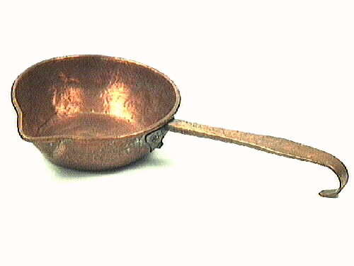 Skopa, cirkulär, med snås på en kortsida. Skopan är slagen runt en järnring. Kompakt, rakt handtag som böjs i enkel öppen ögla i ändstycket och är fäst i skopan på triangulärt fäste med tre kopparnitar. Skopan är delvis förtent. På skopans undersida är tre eventuellt fyra oläsliga ord ristade.