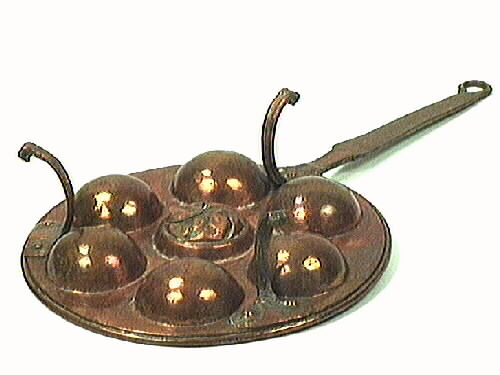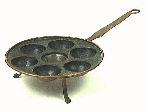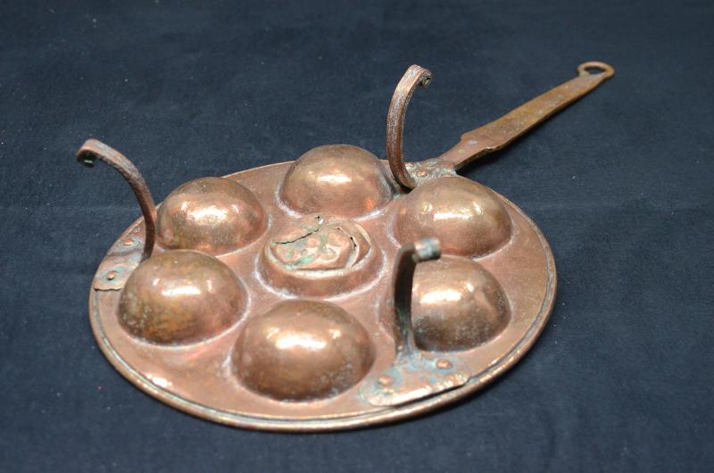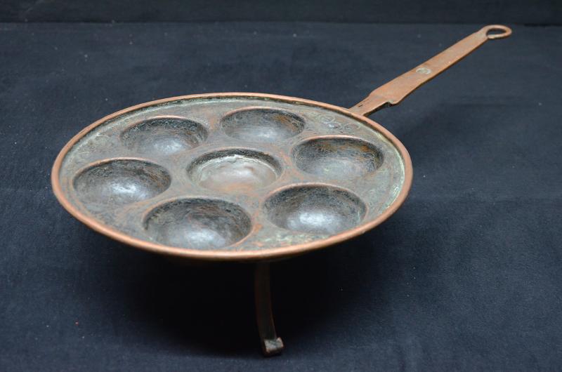 Munkpanna helt i koppar, rund med plats för 7 munkar. Rund panna med mittersta munkformens botten dekorerad, sexdelat motiv. Tre kopparfötter avslutad med liten volut. Två fästen är rektangulära med två kopparnitar på varje. Det tredje benets fäste är bladformigt med tre kopparnitar och fästet övergår direkt i det långs, plana mot änden avsmalnade handtaget. Handtaget avslutas i en ögla med ändsty...