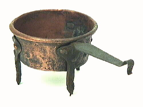 • Kastrull, trebent. Överkanten slagen runt järnring. Ben av järn med hjärtformade fästen med tre handsmidda kopparnitar. I ett av fästena sitter även handtaget, vinkelrätt mot kastrullen. Handtaget smalnar av ut mot änden, avslutas i en liten krok. Till vänster om handtaget finns en lagning med rund kopparbricka och fem kopparnitar. Spår av sot på kastrullen.