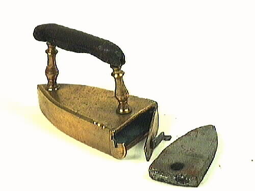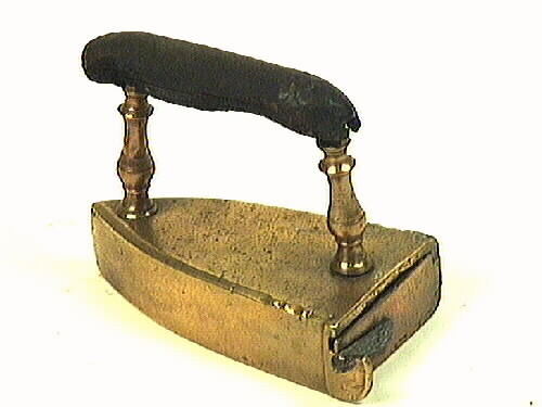 Strykjärn, ihåligt med lucka baktill, stängs med järnhasp. I strykjärnet finns ett glödlod av järn, försett med ett hål för att kunna fattas och förflyttas. Profilerade ståndare och ett handtag av trä påträtt på överstycket. Handtaget bränt och lagat.