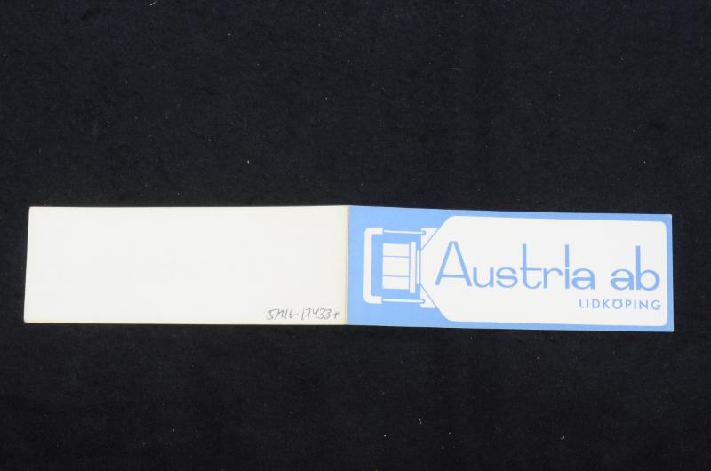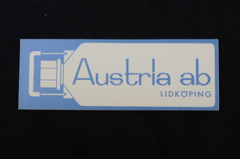 Visitkort av tunn papp, dubbelvikt på längden. Framsidan har en stiliserad plastflaska och text Austria ab LIDKÖPING. Bakgrunden liksom texten är blå, flaskan är i kontrastfärgen vit. Innanför, på insidans högra sida finns text med stora bokstäver: FRANZ KARNER och med mindre bokstäver placerade direkt under: DIREKTÖR. I nedre vänstra hörnet: TELEFON 225 05 (VÄXEL) I nedre högra hörnet står: LIDKÖPING SWEDEN Visitkorten är oanvända, men några har börjat gulna något. Firman Austria AB startades och ägdes av Franz Karner. Den var verksam 1957-1965, vartefter den såldes till PLM.