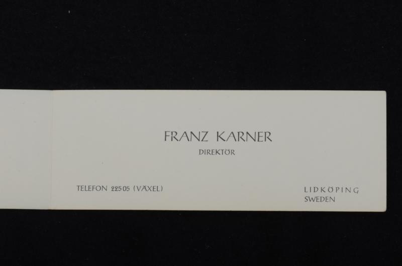 Visitkort av tunn papp, dubbelvikt på längden. Framsidan har en stiliserad plastflaska och text Austria ab LIDKÖPING. Bakgrunden liksom texten är blå, flaskan är i kontrastfärgen vit. Innanför, på insidans högra sida finns text med stora bokstäver: FRANZ KARNER och med mindre bokstäver placerade direkt under: DIREKTÖR. I nedre vänstra hörnet: TELEFON 225 05 (VÄXEL) I nedre högra hörnet står: ...