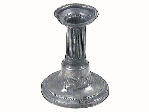 Ljusstake, klockformad fot med pärlstavsdekor, räfflad pelare, skålformad manschett. Ljusstaken är något bucklig i foten och har en spricka i manschetten.