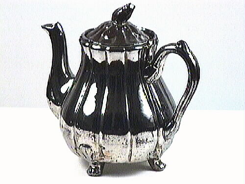 • Kaffekanna med lock. Välvd form, hög pip, generöst handtag. Locket har en sned topp samt "pyshål". Kannan är silverglaserad, står på fyra fötter.
