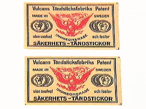 Etikett i färgerna rött, gult och svart. Bilden föreställer i mitten en örn i rött och gult med en röd och gul banderoll med röd text: "TRADE MARK". Två medaljer på vardera sidan om örnen i gult och svart. Svart text på gul bakgrund: "Vulcans Tändsticksfabriks Patent. MADE IN SWEDEN, utan svafvel och fosfor, SÄKERHETSTÄNDSTICKOR".