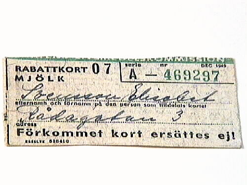 Rabattkort för mjölk. Grönt avklippt band upptill med text: STATENS LIVSMEDELSKOMMISSION. Svart tryck: RABATTKORT 07 MJÖLK, serie A - nr (löpnummer) DEC 1945. (namn, adress) "Förkommet kort ersättes ej". På baksidan står: "Kortet är icke giltigt utan innehavarens namn. Kupong berättigar till rabatt på mjölk med det belopp, för den kvantitet och under den tid, som meddelas i radio och i pressen. L...