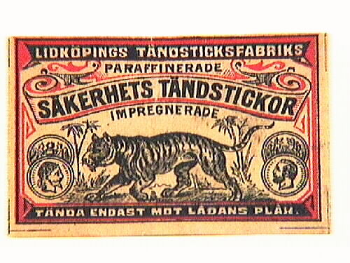 Etikett i färgerna rött, svart och gult. Bilden föreställer en tiger i svart och gult, med två medaljer på vardera sidan av tigern i svart och gult. Längst upp gul text på svart bakgrund: "LIDKÖPINGS TÄNDSTICKSFABRIKS". Nedanför svart text på gul bakgrund: "PARAFFINERADE. Något längre ned gul och röd banderoll med svart text: "SÄKERHETSTÄNDSTICKOR". Nedanför svart text på gul bakgrund: "IMPREGNERA...