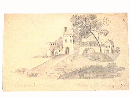 Teckning föreställande en borgliknande byggnad. Huset är beläget på en ö eller är omgivet av en vallgrav. Tre torn syns, samt murar däremellan. Text: RITADT AF EMMA TRANCHELL. LIDKÖPING DEN 1 STE APRIL 1853.