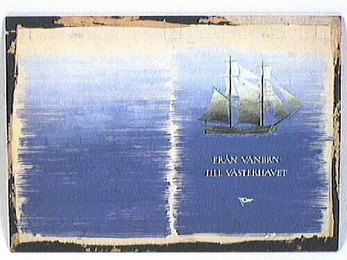Målning på papper moterad på en masonitskiva. Den föreställer ett segelfartyg mot en blå bakgrund. Text: FRÅN VÄNERN TILL VÄSTERHAVET. Under texten en vit flagga med ett svart A. Bilden kan vara något slags förlaga till ett försättsblad eller liknande till en bok. På baksidan står skrivet med blyerts AHLMARKS, KARLSTAD.