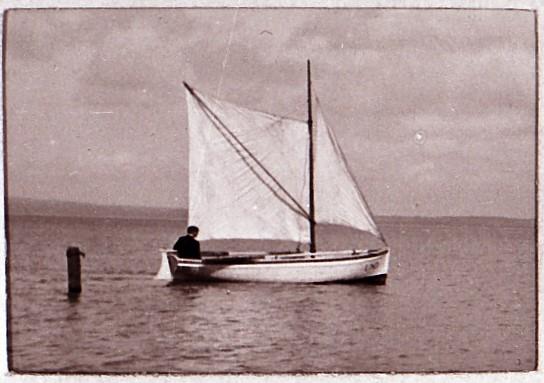 Segeleka på Kinneviken. Storsegel och fock är hissade. Gösta Falkengren (f. 1888), fader till Sven Falkengren, har bevarat detta foto (ur ett album) efter sin broder, Uno (f. 1889).