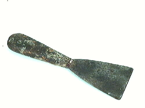 Stålspackel med ovalt trähandtag. Handtaget är täckt med färgrester.