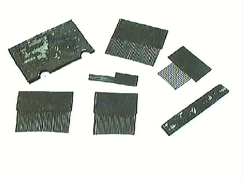 Åderkam. Rektangulärt, smalt etui av plåt, med fem stålkammar i olika storlekar.Kammarna användes vid ekådermålning. Etuiet har två halvcirkelformade utskärningar vid övre kanten, för att kammarna skall kunna tas ut. Locket utgöres av en hylsa. Kammarna har:36 tänder, varav en är borta. 44 tänder, varav två är borta. 34 tänder, varav två är borta. 26 tänder, varav nio är borta. 15 tänder, varav se...