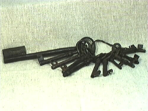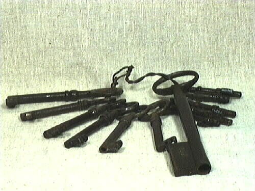 Nyckelknippa bestående av tolv stycken nycklar, varierande storlek, form och ax. Fyra med oval ögla och åtta med öglans inre i form av en öppen åtta. Nycklarna samlade på en cirkel av två snodda järntrådar. Rostigt föremål.