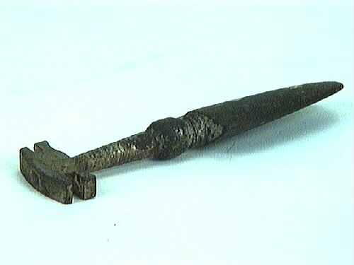 Glasskärare Glasskärarens huvud är i förnicklad metall, med stämpel "UNIVERSAL". Handtaget är av trä, paddelformat och med inläggning i pärlemor. Metallen är rostig och handtaget sitter löst.