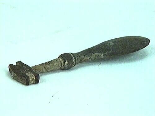 Glasskärare Glasskärarens huvud är i metall och två stjärnor är ristade på ena sidan. Handtaget är i trä, paddelformat och med metallstift på ena sidan, som dekoration. Rikligt med torkad lera på "huvudet".