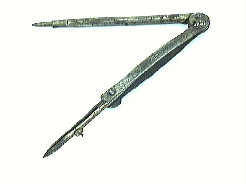 Passare, en skänkel cylindrisk med liten cisselerad dekor vid spetsen. Den andra skänkeln består av två parallella järnskivor i vars ände de hålls fästa vid det mellanliggande cylinderformade röret med en skruv. Röret i centrum avslutas i en spets och har en skåra vars tjocklek regleras med en skruv, rörets vinkel i förhållande till övriga skänkeln kan också relgeras. Led med runda hylsor. På ena ...Visa hela