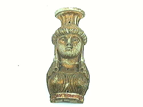 Ornament Ett ornament av gips, som varit fastlimmat vid något föremål, såsom ram eller dylikt. Förgyllningen är dels på röd, dels på vit grund. Nedtill och upptill är ett hål för uppfästning. Gipset har varit trasigt i flera delar, men är ihop- limmat. Av guldet är mycket borttvättat. Funktion: förgyllare Motiv: figur.