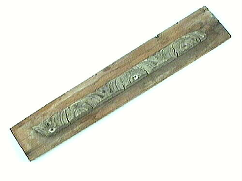 • Ornamantprov, gjutet prov på gipsornament, 333 x 25 x 12 mm. Använd av förgyllare. Vågformigt profilerad list prydd med stiliserade blad och blomformer. Provet fastspikat på furubräda från margarinlåda. Provet sprucket.