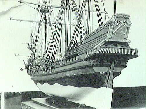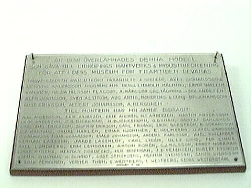 Även neg nr 5M16/Fo 297:7 Bilaga: arkiv 219, 501 (ritningar). Båtmodell av pinassen Kalmar Nyckel tillverkad i Holland 1629. Kalmar Nyckel var ett fjortonkanoners skepp om 130 läster. Skala 1:25. Skeppet seglade som första svenska fartyget över Atlanten 1637-38. Fartyget ägdes av Söderkompaniet, Stockholm. Modellen är skuren i trä, tre master utan segel och bogspröt. Masterna med vant, stag etc. Skrovet är vitmålat upptill vattenlinjen och målad med skumrand, svart ovan vattenlinjen, träfärgad och målad i klarblått, svart och rött. Hela båtmodellen står på två mindre förgyllda träfötter i blomform och ett större i mitten i drakform-fötterna står på en sockel vars sidor är grönmålade kolonialbilder och två silverplaketter tillverkade av guldsmed S. Ahlström, Lidköping 1938. Svensk flagga hissad i för och akter. Krönt lejon som galjonsbild i fören, andra galjonsbilder, två metallankare med trästock på varje sida om båten. Däcksplanet i bräder i faner, nagelbänk vid varje mast, rå på alla masterna och gaffel på kryssmasten. Kanoner och kanonvagnar. I aktern rak akterspegel med vitmålat galleri, därovanför två korsställda förgyllda nycklar, tre lampor med förgyllda hus, flaggstång. I aktern står det: Yngve Leierth, Benjamin Lidholm 1937. Axel Johansson, Henning Andersson 1938. Modellen är tillverkad av Lidköpingsbor i trä-och snideriarbeten, Yngve Leierth, riggning mm Axel Johansson och Henning Andersson, målning Benjamin Lidholm, kanoner Ernst Wallin, flaggor Hilda Nilsson, tågvirke A. Månsson, Göteborg. Diverse arbeten Alfred Johnsson, Sven Ahlström, August Artig, Nordfors och Companie, br. Johansson, Gustav Eriksson, Albert Johansson, A. Berggren. Båtmodellen har tre lösa svenska flaggor. Akterns flagga är blekt och skör. Vid katalogiseringstillfället skadades båten, ny akterflagga tillverkad vid Skara Länsmuseum. Bilaga: ritningar, åtta stycken fotografier från 1940-talet, två stycken svenska flaggor. Vid transport från Stadshuset till Förrådet på Sopckerbruksgatan hösten 2017 skadades en av masterna. Behöver limmas.