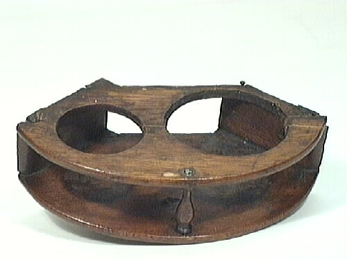 Karaffställning i trä, från fartyg. Ställningen är i form av ett avskuret cirkelsegment med ovan- och undersidans framsida svängd.Ovansidan har två runda öppningar, en större och en mindre. Ovan- och undersidorna är sammanhållna med två korta kortsidor. Mellan sidorna är en liten svarvad baluster fäst. I denna ställning förvarades vattenkaraffen och ett glas. Ställningen har suttit på väggen. Fer...Visa hela