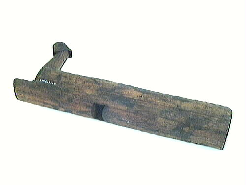 Kälhyvel. En kälhyvel, med rundad undersida, utskjutande framtill, där ett svarvat hantag, göken, är fäst. Handtaget avslutas med en volut. Utmed långa långsidorna är en ränna hyvlad. Rännan gör att man får ett bättre grepp vid arbetet. Hyveln användes för att hyvla en skåra eller annan rundad yta. Järn och kil saknas. Vid katalogiseringstillfället låg hyveln i timmer- manskistan 5M16-2851. 1981...