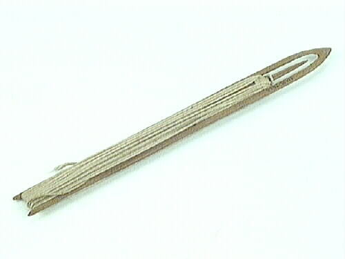 Nätnål med garn. Nätnål med bomullsgarn. en platt, avlång träbit, med två skalmar i den ena ändan, som går ihop i en spets. Mellan skalmarna är en spetsig tunga utskuren, ca 35 mm lång. Avståndet mellan skalmarna och tungan är ca 3 mm. I den andra ändan är två små öron utskruvna, som håller garnet på plats. Garnet är lindat på nålen, som används vid knytning av nät. På nålen står skrivet: "C J Brand, den 16/3 1895".