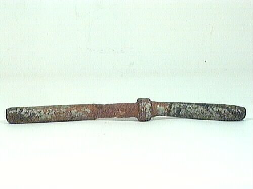 Koffernagel av järn. Nageln sättes in i nagelbänken vid mast eller reling, på nageln belägges tampändarna. Koffernageln har formen av en pinne med rundade ändar, på 230 mm avstånd från nedre änden finns en 10 mm bred ring som utgör fäste i nagelbänken. 1982 04 21 Föremålet rengjort med fotogen.