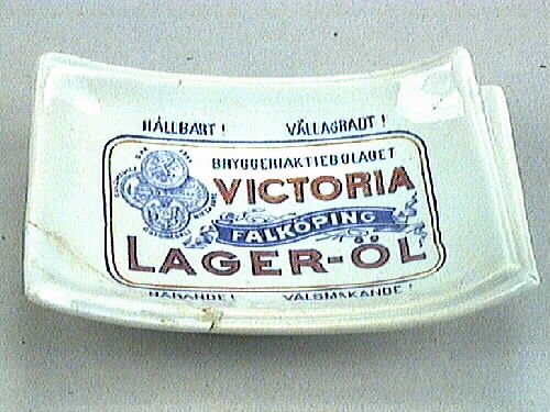 Askfat Ett askfat, välvt med uppåtgående hörn och en utanpåliggande, sned kant på två sidor. Formen är rektangulär med en oval sockel som fot. På botten finns ett firmamärke påtryckt, med texten: BRYGGERIAKTIEBOLAGET VICTORIA, FALKÖPING, LAGER-ÖL och fyra stycken medaljer. Uanför ramen står. HÅLLBART! VÄL- LAGRADT! NÄRANDE! VÄLSMAKANDE! Askfatet har en vit grundfärg, firmamärket är blått, rött och...