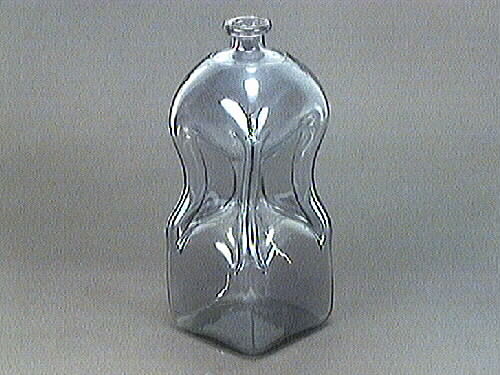 Strålaflaska En rektangulär strålaflaska i blåst glas. Den har en kvadratisk nedre del, mittpartiet är in- tryckt på mitten och kanterna är insvängda och rundade. Ovandelen är rundad, en kort, rak och rund hals med halsring överst. Under är en nedsänkt bred cirkel som krage. Botten är något intryckt på mitten. Kanalen mellan de två avdelningarna är kvadratisk. Flaskan är genomskinlig och har en li...