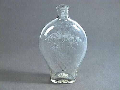 Fickflaska En fickflaska av ofärgat glas. Den har oval botten, platta långsidor och kort konisk hals. Pressat mönster av räfflor upp till halsen. På ena sidan är det inpressat en vindruvsklase med två stiliserade blad. På den andra sidan en bild, som påminner om Västergötlands vapen (lejon) med krona ovanpå.