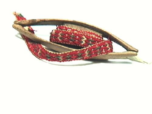 Band på skyttel. Mönstervävt band i rött och grönt på oblekt varp. Upprullat på snidad spolformad skyttel. Några mindre malskador. Förvarad i magasin på Hästhagsvägen fram till augusti 1981.