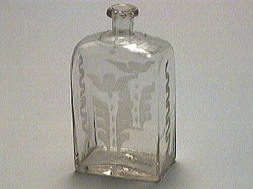 Brännvinsflaska En brännvinsflaska i blåst- och blästrat glas. Den är rektangulär, med välvd ovansida och runt halsen en utvälvd cirkel, rak hals, men något vidare upptill mot halsringningen. Bottnen har raka kanter och är något inbuktad på mitten längs långsidorna, något mer inbuktad på insidan. Flaskan är blästrad på alla fyra sidorna. På kortsidorna är girlanger och långsidorna har blommotiv. ...