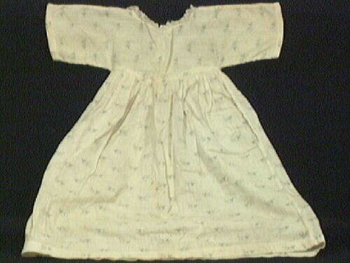 Dockklänning, sydd av en typ av crepetyg av bomull med tryckta lila blommor och gröna blad. Avskuren under ärmarna, kjolen rynkad. Spets runt halsen. Öppen en bit i ryggen, knäpps med tre tryckknappar. Några rostfläckar. Fram till augusti 1981 förvarad i magasin på Hästhagsvägen.