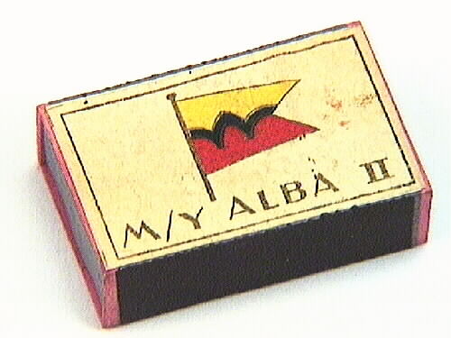 Tändsticksask med tändstickor. En tändsticksask med stickor. Stickorna och de smala långsidorna har svart plån. På framsidan är en vit etikett kantad med ett förgyllt streck, i centrum en flagga på stång. Flaggan är röd och gul med en svart våglinje mellan. Flaggans framsida är uddformad. Under flaggan står M/Y ALBA 11. Asken och stickorna är gjorda i Lidköping och etiketterna i Tidaholm. M/Y ALBA var Ivar Krügers lustjakt. Se även 5M16-4352.