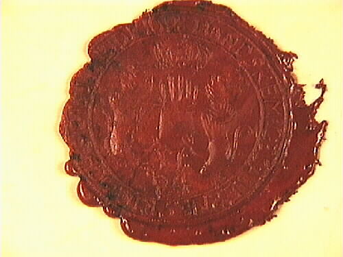 Sigillavtryck på vitt papper. Sigillet är av rött lack och är runt med texten: HANDSKEN. GESÄLERNES. RIKTIGHET. SIGIL. UTI. LIDKÖP. I mitten är en handske krönt av en krona och på varje sida är två djurliknande figurer. Under motivet året 1784.