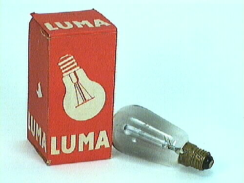 Glödlampsförpackning med glödlampa. En glödlampa som förmodligen tillhört en projektor. Glödlampan har klart glas. Färgen på förpackningen är vit och orange. Glödlampsbild på två sidor på förpackningen. Märkt med Luma. Glödlampans mått: 150 mm lång och 65 mm bred.