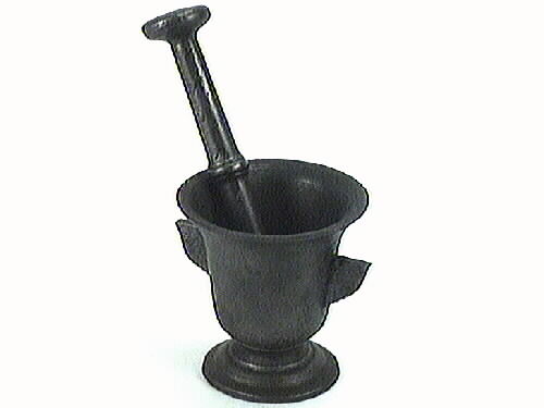 Mortel med stöt. En mortel av gjutjärn, med stöt. Morteln har formen av en urna med fot och två öron eller handtag. Den övre kanten är lätt svängd utåt. Foten är gjuten för sig och är fastskruvad i själva behållaren. Mortelstöten är 170 mm lång och har en tjocklek av 120 mm. Stöten är tjockare i ändarna, där själva malningen sker. Den ena tjänar som hand- tag och den andra som stöt.