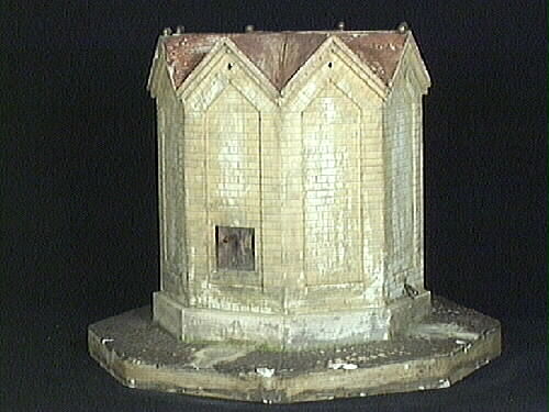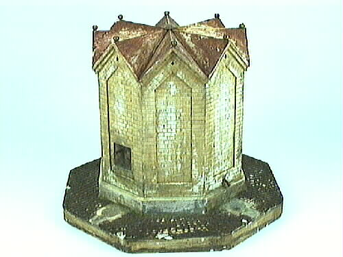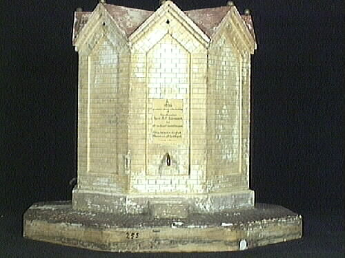 Vattenpumpsmodell. Modell av den åttkantiga vattencisternen i Lidköping. Modellen står på en åttsidig bottenplatta med ovansida som imiterar kullersten. Tillverkarens namn står målat på plattans sida. Det finns tre kopparkranar på olika nivåer. Den ena har en vattenho under, två andra har ett avrinningssystem. Varje sida avslutas upptill i en spets och taket blir åtta dubbla triangelformade taksek...