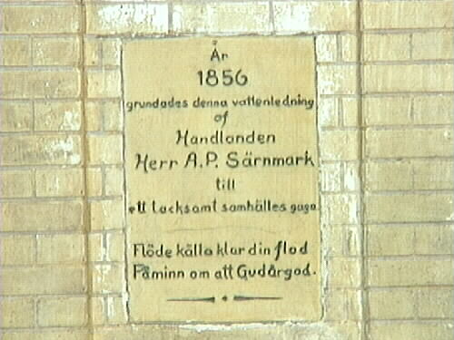 Vattenpumpsmodell. Modell av den åttkantiga vattencisternen i Lidköping. Modellen står på en åttsidig bottenplatta med ovansida som imiterar kullersten. Tillverkarens namn står målat på plattans sida. Det finns tre kopparkranar på olika nivåer. Den ena har en vattenho under, två andra har ett avrinningssystem. Varje sida avslutas upptill i en spets och taket blir åtta dubbla triangelformade taksektioner. Varje sektion kröns av ett guldmålat klot och i centrum kröns taket av ett större klot med krona på. Infälld textplatta på en sida med texten: "År 1856 grundades denna vattenledning af Handlaren A.P. Särnmark till ett tacksamt samhälles gagn. Flöde källa klart din flod. Påminn om att Gud är god". Den "Särnmarkska Pumpen" var ingen pump i egentlig bemärkelse, utan en stor järncistern, försedd med två kranutrustade utlopp på olika nivåer och ett bräddavlopp, det sistnämnda mynnnde mot Lidan, så att överskottsvattnet rann ned i Lidan då cisternen var fylld. För att skydda cisternen mot kyla var den inbyggd i ett åttakantigt murverk (sannolikt även en mellanisolering) med åtta gavelspetsar. Takbeläggningen är oviss,då hörsägen med på 40-talet gamla lidköpingsbor har resulterat i tre alternativ: kopparplåt, skifferplattor och rödmålad svartplåt. Pumpen revs 1904 och som minnesmärke uppfördes en ny vattenkastare efter arkitekt Kjellmans ritningar. Denna anslöts till den nya vattenledningen och försågs med två marmortavlor, en med den ursprungliga texten från Särnmarks pump och en med texten: "År 1904 ombyggdes detta vattentorn, uppbyggt till minne av handlanden A.P. Särnmark, gamla vattenledningens grundläggare och donator".