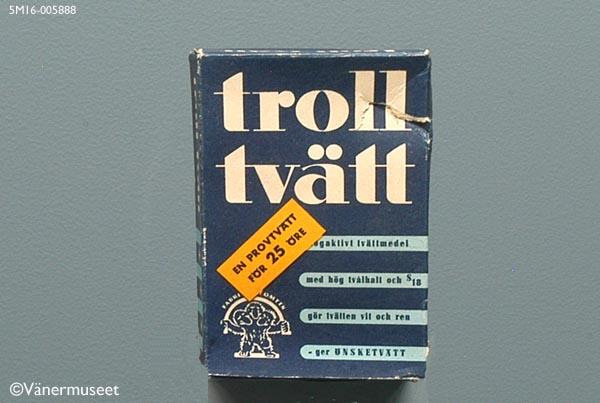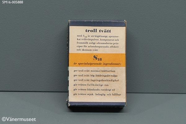 Tvättmedelsförpackning med tvättmedel, provförpackning, "Troll tvätt". Framsidan och sidorna på förpackningen är mörkblå. På sidorna står "troll tvätt" med vit text. På framsidan står "troll tvätt" med vit text och under med mörkblå text på ljusblå band: "högaktivt tvättmedel med hög tvålhalt och S 18 gör tvätten vit och ren - ger ÖNSKETVÄTT". På baksidan står med blå text på vit botten och ett gult band mitt på: "troll tvätt med S 18 är ett högklassigt, spraytorkat tvåltvättpulver, komponerat och framställt enligt ultramoderna principer för arbetsbesparande, effektiv och skonsam tvätt. S 18 är specialutprovade ingredienser: ger troll tvätt maximal tvättverkan ger troll tvätt hög löddringsförmåga ger troll tvätt lagringsbeständighet gör tvätten fullkomligt ren gör tvätten bländande, varaktigt vit gör tvätten mjuk, behaglig och hållbar". På framsidan finns firmamärket, en pälsklädd gubbe med tre huvuden. Över står: "FABRIKEN TOMTEN". En tryckt gul lapp med texten "EN PROVTVÄTT FÖR 25 ÖRE" sitter snett över förpackningens framsida. Tvättmedlet ligger i en brun innerpåse. Tvättmedelsförpackningen är inköpt på Lions marknad i Hjo 1968.