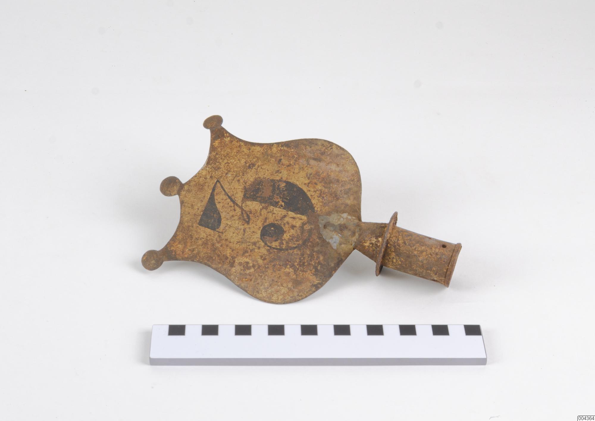 Fana i rött tuskaftvävt ylletyg med en vit infälld trea i bomullstyg. Fanan är smutsig, hårt sliten, hål och uppsplitsade sidor. Rund trästång, obehandlad, ett f d räfsskaft. På stångens övre del en etikett med texten "MOTALA RÄFSAN, Verkstads AB, Lindqvist, MOTALA. Stark-Hållbar-Billig-Omtyckt. Bergström, Motala 1948". Överst på stången en plåtsköld med överkanten markerad med tre cirkulära utskärningar. På skölden är målat en svart trea på båda sidor. Skölden är målad gul och är rostig och avflagnad. Troligen har brandväsendet använt fanan. Bilaga: Tidningsartiklar Lidköpings Hvarjehanda 1960, NLT 1982-04-07. Arkivet 368.