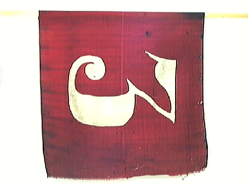 Fana i rött tuskaftvävt ylletyg med en vit infälld trea i bomullstyg. Fanan är smutsig, hårt sliten, hål och uppsplitsade sidor. Rund trästång, obehandlad, ett f d räfsskaft. På stångens övre del en etikett med texten "MOTALA RÄFSAN, Verkstads AB, Lindqvist, MOTALA. Stark-Hållbar-Billig-Omtyckt. Bergström, Motala 1948". Överst på stången en plåtsköld med överkanten markerad med tre cirkulära utskä...