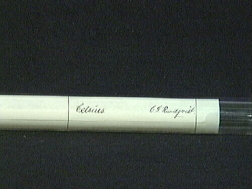 Alkoholmätare med etui. Inv nr 5M16-6651:1 Alkoholmätare, s k termoalkoholometer. Används för mätning av alkohol i procent. Alkoholmätaren är i glas och ca 380 mm lång, omkretsen 55 mm. Den består av en ihålig flytkropp, som nedtill är försedd med en kulformig del, innehållande kvicksilver. Upptill har mätaren en cylinderformig del, spindeln, där skalan i procent finns. Nederdelen av mätaren är en termometer, därav namnet termoalkoholmeter. Termometern sträcker sig från -24 grader Celsius till 35 grader C. Alkoholmätaren är graderad från 38% till 97%. Mätning av alkoholhalten skall ske när vätskan har en temperatur av +15 grader C. Därför finns en termometer på mätaren. Har vätskan inte denna temperatur får man en skenbar alkoholhalt som kan korrigeras med hjälp av en särskild tabell. På mätarens termometerdel finns skrivet "CELSIUS" och namnet "C.G. Rundqvist". Inristat i glaset på denna del är också "No 55 L=12, 801 t A.W.C.". Alkoholmätaren är kontrollstämplad av A.W. CRONQVIST, STOCKHOLM. På denna del är också skrivet "No 55. 38%-97% W= 37.408 gr A.W. CRONQVIST d 1/12 86". 6651:2 Etuiet till mätaren är i trä och har en sammetsklädd yta inuti. En liten hasp låser fodralet.