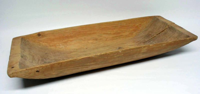 Degtråg (baktråg, knådtråg) av trä. Tråget har en rektangulärform med något avrundad botten. Tråget har en stor spricka i längdriktningen och på båda kortsidor är järnband fästa.