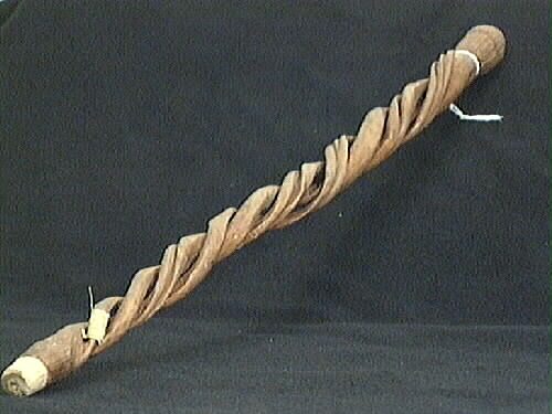 • Promenadkäpp av skuren, vriden enrot. Rundmejslad knopp med nedåtgående bladmönster. Avsmalnande. Mellanbrun. Nertill har troligen suttit en hylsa.